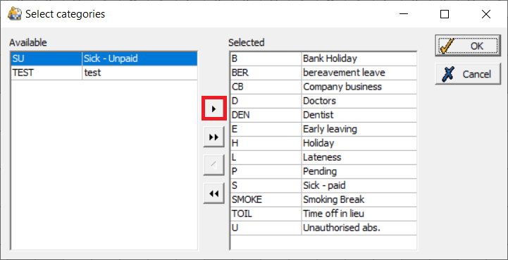 In WinTMS, go to the Absence Profile, click the “Absence codes” button and move the required codes to the right hand list.