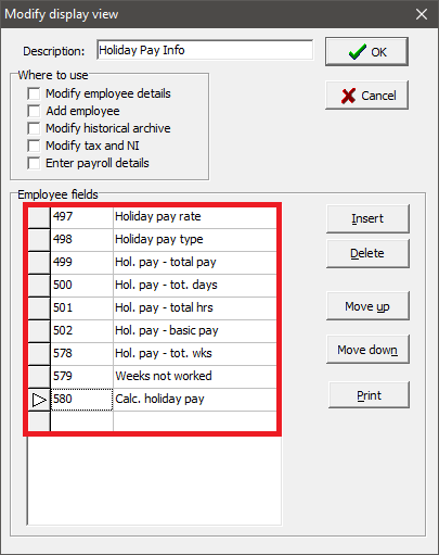 Click the Add button to add a new Display view. Enter a name for the new Display view in the window that appears, and click OK. This will open the Modify display view window. You will need to add several fields to the Employee fields of this Display view. Use the Insert button to add new rows to the Employee fields table. The following Employee fields are useful for viewing changes to Holiday pay: