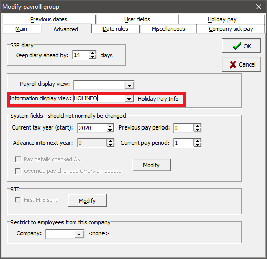The Modify payroll group window will open. Open the Advanced tab (keyboard shortcut ctl+A). There is a drop-down menu labelled Information display view – use this to select your newly created Display view, and click OK: