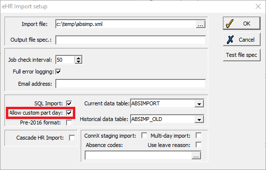 EHRIMPORT.exe has been updated with a new setting to allow for a custom Absence. To allow this, open the Settings page of the Controller, and tick the new Allow custom part day checkbox: