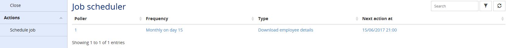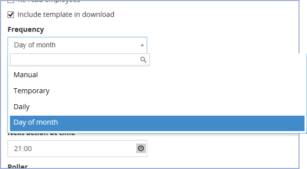In this example, the job will download employee details to a terminal. It will run on the 15th day of every month at 9pm. It will remove inactive Employees from the terminal.