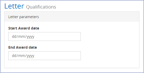 An additional section called 'Letter parameters' will include fields needed for the letter to be run. In the below example, the Start and End award date for the 'Qualifications' letter is needed for the selected Employee as those two fields are used within the letter to identify the correct qualification(s):