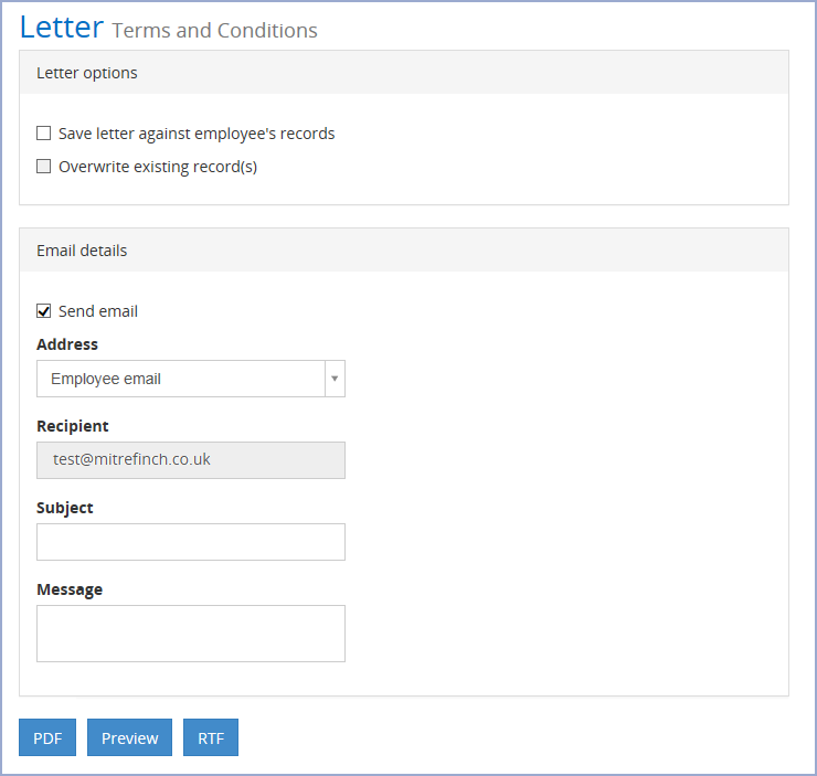 The name of the letter is next to the main header at the top of the page. The Letter feature uses the currently selected Employees details to fill in the information within the letter. Clicking on PDF will download the letter in the .pdf format and clicking RTF will download the letter in the .rtf format. When a Supervisor downloads a letter, the letter will be run against the currently selected Employee and any additional options enabled on this page will be processed.