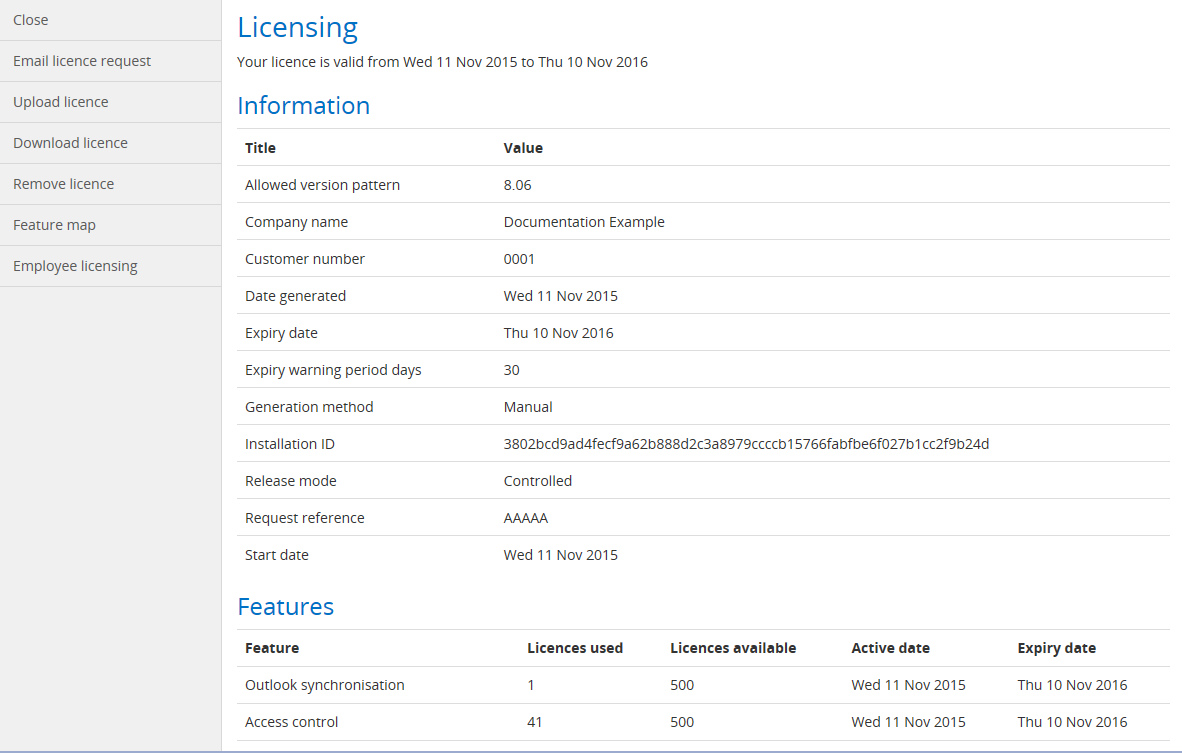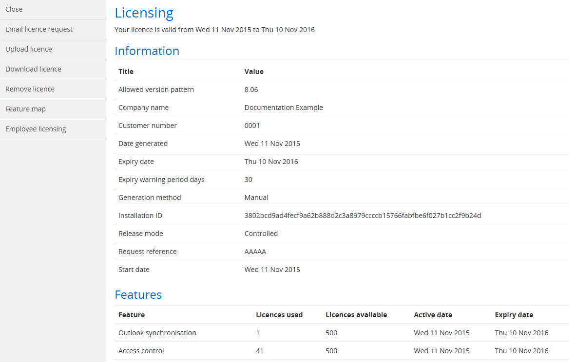 The Licensing page in TMS 8 allows you to view information about your existing licence and information about the licences for specific features. In addition to this, a number of options are available for managing and maintaining licences for you and your Employees.