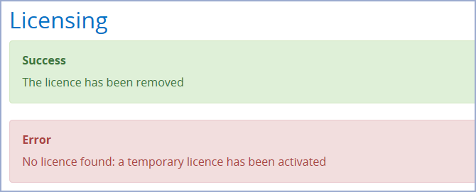 Click Cancel to abort the removal or click Remove to discard your existing licence. Your existing licence will be removed and you will be directed back to the Licensing page where a temporary licence is issued to you. The following warning messages are displayed at the top of the page: