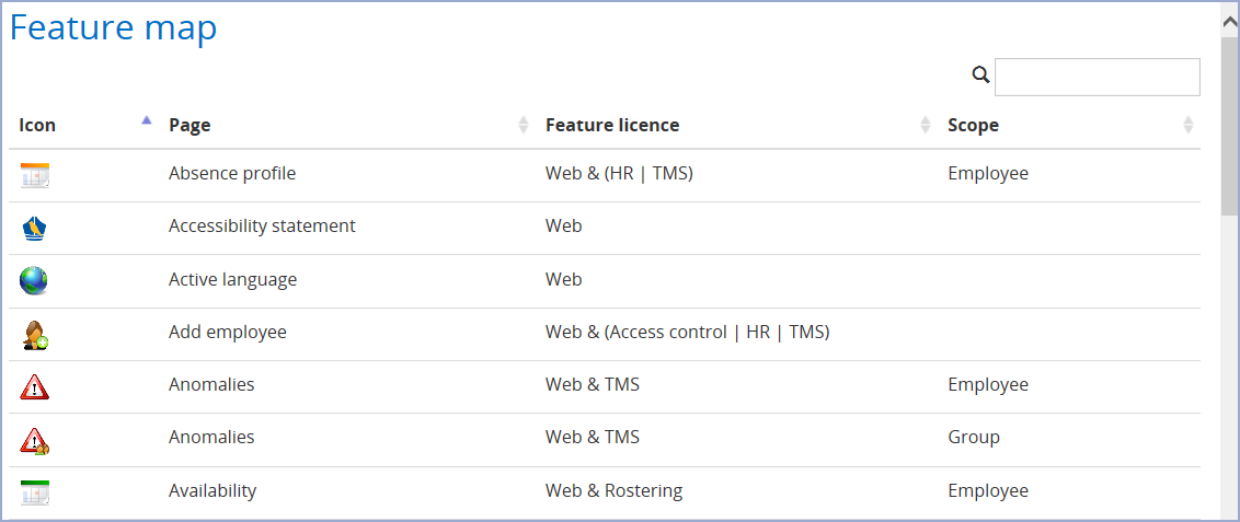 Feature map — opens a new page with a list of all the TMS 8 Features, what scope they are and what licences are needed to access them. For example: