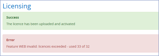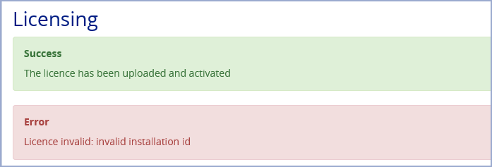 Under certain circumstances a licence may be invalid but can still be uploaded. A success message will appear at the top of the page saying the licence was uploaded and activated, however, a second error message states that the licence is invalid. For example: