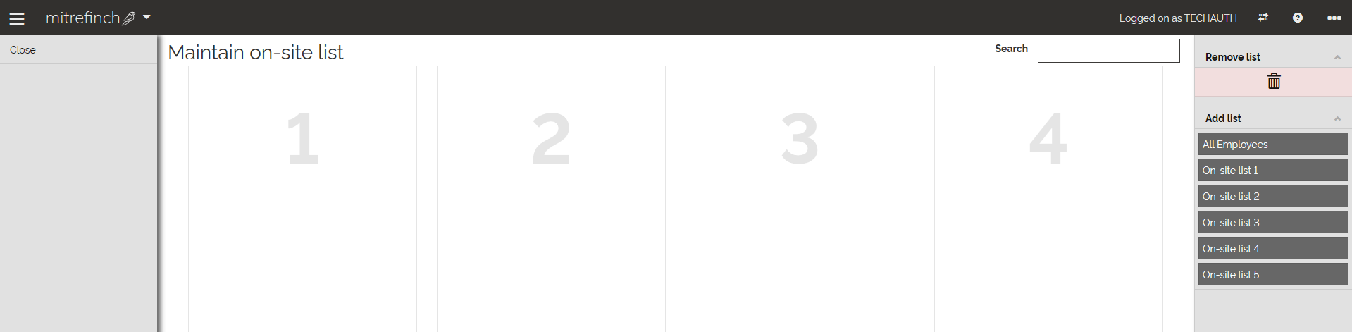 The Maintain on-site list page allows a Supervisor to modify On-site lists and organise how they are displayed on the main page. To access the Maintain on-site list page in TMS, select On-site list from the menu in the drop-down Header pane, then select Maintain on-site list from the left-hand pane.