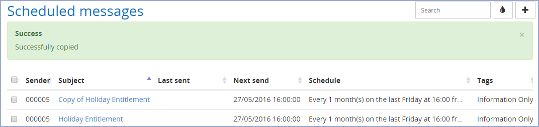 Clicking this option will create a copy of the Scheduled message you are currently modifying. Once clicked, you will be taken back to the Scheduled messages page, with a success message notifying the message was copied. The copied message will appear in the list with 'Copy of' appended to the subject. Below is an example of my 'Holiday entitlement' message being successfully copied:
