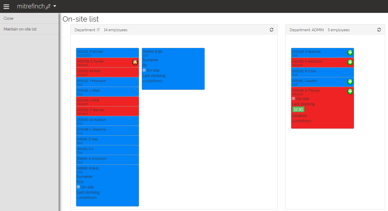The On-site list provides an ’at a glance’ view of which members of a department, or of the entire company, are present (have clocked in). The On-site list can also be used to check that Employees with the appropriate skills are present in order to meet your staffing and Health and Safety requirements.