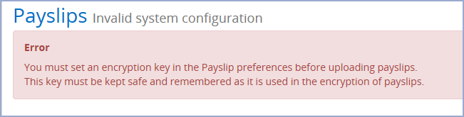 The first time Payslip management is opened, a warning will be displayed advising you to set an encryption key before uploading payslips. For example: