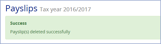 Click Delete to permanently remove the selected payslip(s) from TMS and return to the updated Payslip management page with a success message at the top of the page: