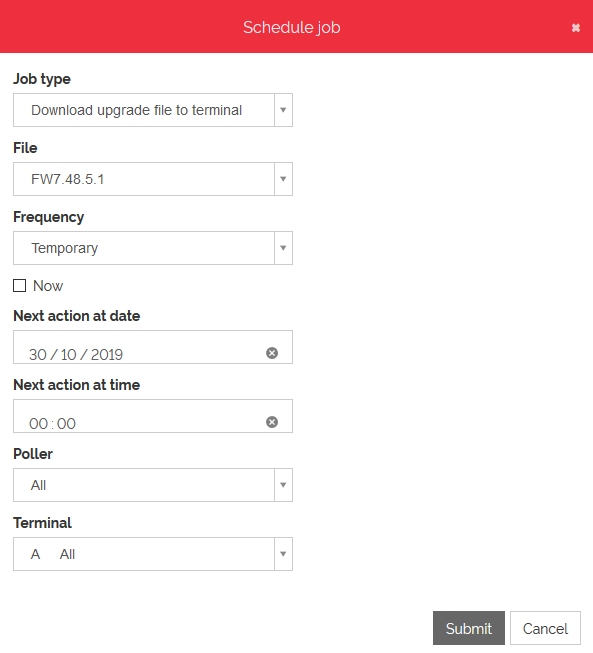 Select Download upgrade file to the terminal as the job type and select All terminals.