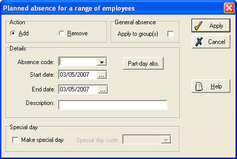 Click Apply, and you will see the Select range form, which allows you to select the employees who are to be absent (see page 25). Complete this form, and the planned absence will be added to the system.