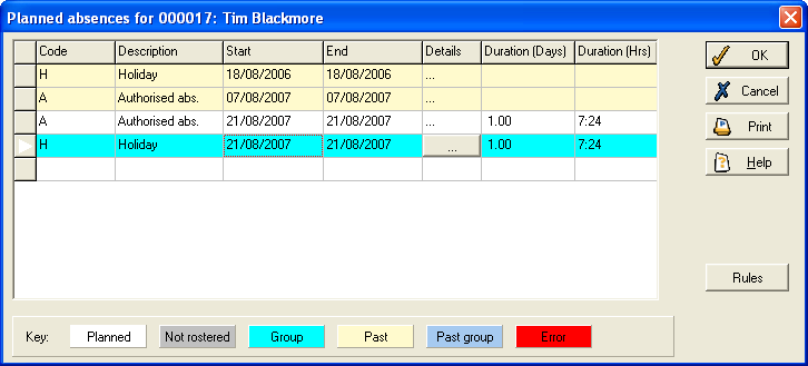In the example above, the bottom row is a general absence included using the new method. This absence is shaded darkly and cannot be edited. The other absences only apply to this employee; the first two are in the past (lightly shaded background) whilst the third is in the future. The checking applied to this list for overlapping absences only takes into account the personal planned absences and does not include any general absences. This checking will be performed later.
