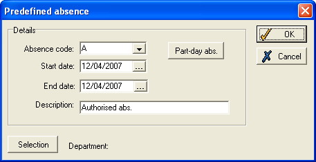 Select the required Absence code from the drop-down list, and enter the start and end dates of the absence. Tick the Part-day abs. button if applicable, and you will be able to use the same Part day absence form used when entering an absence for an individual.