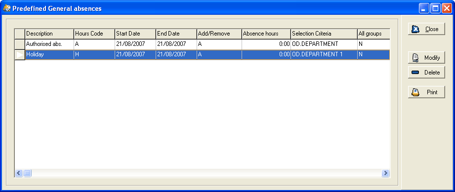 Select Maintain general absences from the System menu. A form similar to the following should be displayed: