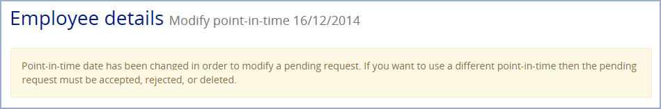 When you have a Request that is pending for any Employee details panel, i.e. a Request that has not been approved by your Supervisor, the Point-in-time date is changed to match the Point-in-time date when the Request was submitted. If you attempt to Modify your Employee details, a message is displayed at the top of the page. For example: