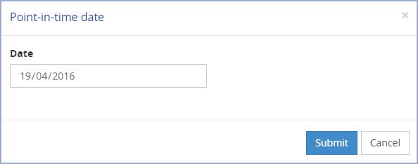 To view a panel on a different date, select the panel by clicking the appropriate tab then change the date in the Point-in-time date field and click Submit. The panel refreshes and is re-displayed as it would appear on the selected date. All other Employee details panels are also displayed as they would appear on the selected date.