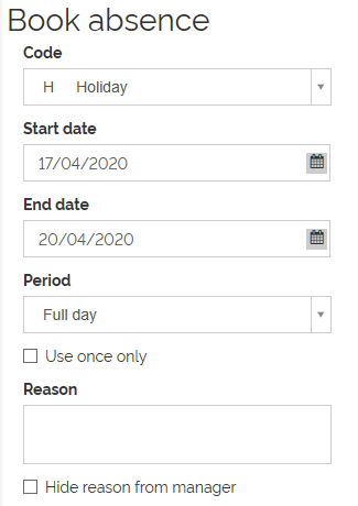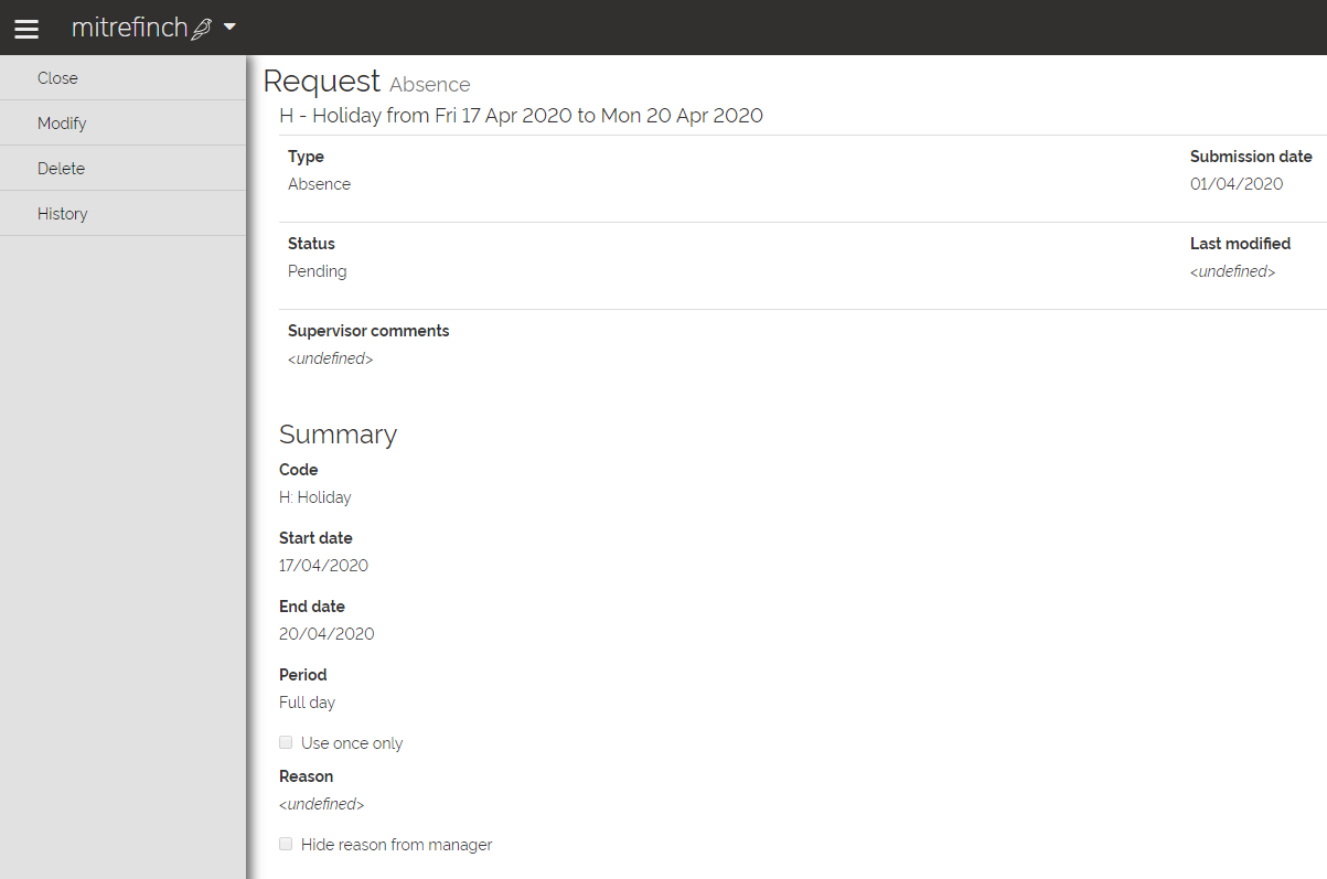 <undefined> is displayed when a field is empty.If you have generated any requests in TMS, you can modify the Request details. First navigate to the Requests page and locate the request you wish to modify. Then click on the Type or Description of the request to open the Request details page and click 'Modify' in the left-hand navigation pane. You are taken to the associated page where you generated the request, below is an example of when an absence is modified: