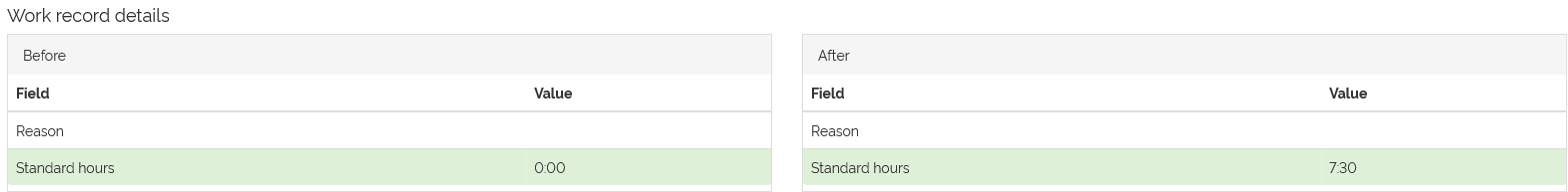 The example below is from the summary in Request details of a Work record. The 'Before' and 'After' shows the changes that will be made if the Request is accepted: