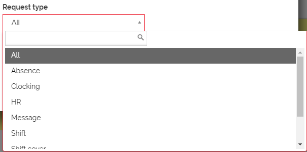 Use the Request Type filter options of 'All', 'Absence', 'HR', 'Shift', 'Shift cover' and 'Work record' available from the Request type drop-down list. By default, 'All' is selected. For example: