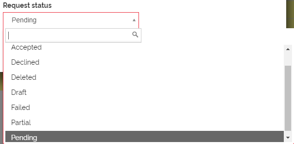 Use the Request status filter options of 'All', 'Accepted', 'Deleted', 'Failed', 'Partial', 'Pending' and 'Declined' available from the Request status drop-down list. By default, 'Pending' is selected. For example: