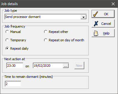 Once you have created this shortcut, double-click it and log in as MASTER. Open the File menu on the toolbar, and click Job scheduler. Click New, and then select Send processor dormant as the Job type. You should then set the Job frequency as Repeat daily, and the next action as 23:30 on the current time. Then, set the Time to remain dormant (minutes) as 2. An example is shown below.