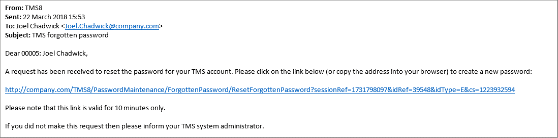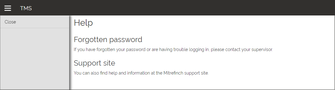 Please note: TMS emails a password reset link to the address specified in your Employee Details. If the email address is incorrect, or no email address is specified, the self-service password reset will not work. It is vital that these records are kept up-to-date.