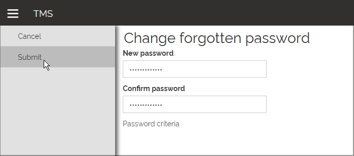 Enter a new password into the New password field, and confirm it in the Confirm password field. Select Password criteria to view your TMS password requirements. When you have entered your new password, select Submit.
