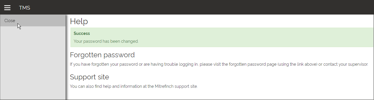 Your password is changed, and you are returned to the Help screen with a success message. You can now select Close and log in using your new details.