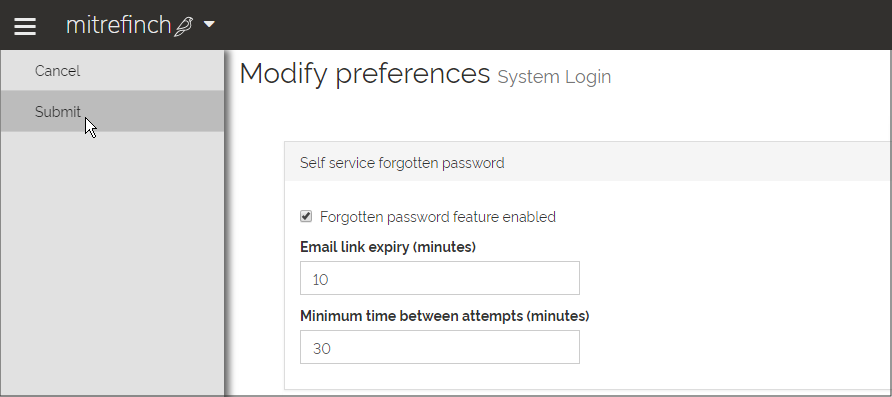 Locate the Self service forgotten password section. Tick the Forgotten password feature enabled tickbox. Two further options are available: