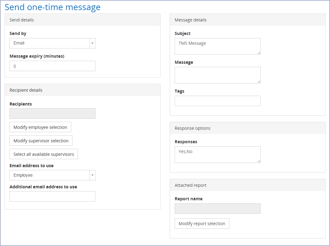 A Supervisor can send messages to Employees or other Supervisors using this page. The message sent is a 'one-time' message and will not reoccur as a Scheduled message.
