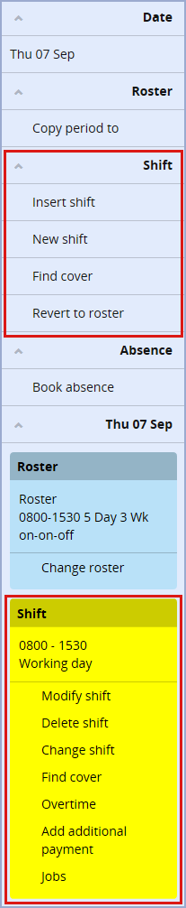 The Shift data type available in Calendars and Group planner allows a Supervisor, with access, to a number of actions. The actions available can be found in the right-hand pane when highlighting a date range on the planner that contains unprocessed days. For example: