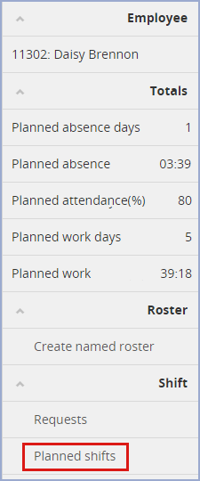 Planned shifts — opens the Planned shifts page where the selected Employees planned shifts are displayed in a list. See Planned shifts for more details