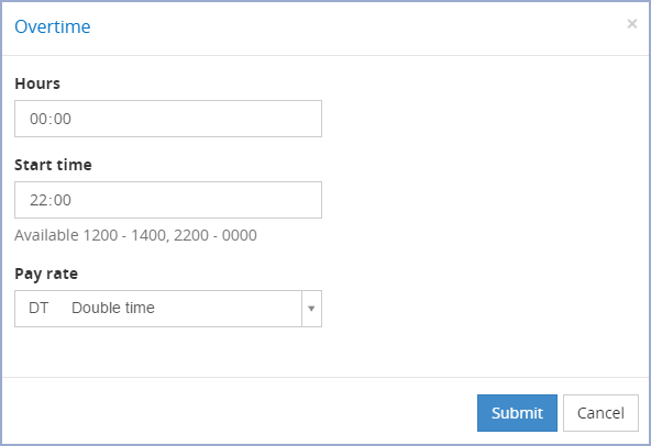 Input the amount of Hours the overtime will be and input the Start time (the available start times are displayed under the field). Finally, select the pay rate of the overtime and click Submit to save the changes and authorise the overtime.