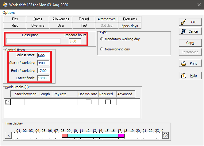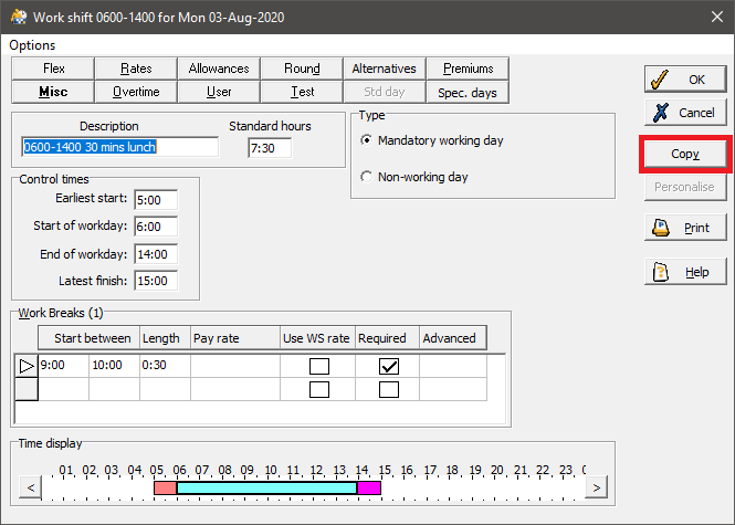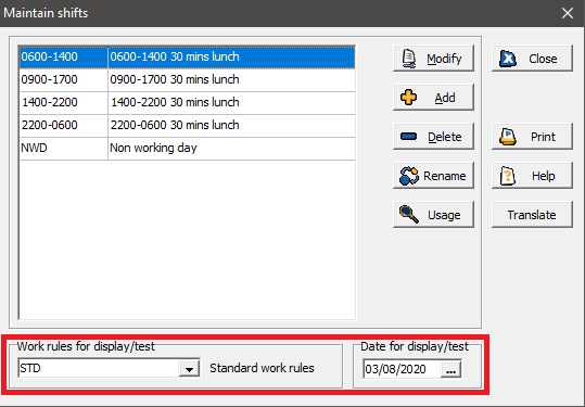 - Works rules for display/test: this setting will allow you to choose which work rules you are viewing. This will affect the view displayed when modifying shits, as well as changing what fields you can see.