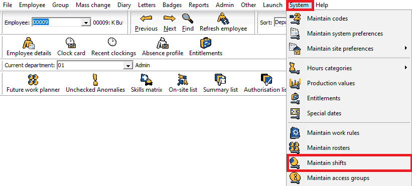 To begin with, open the System menu in the WinTMS toolbar and click Maintain Shifts.
