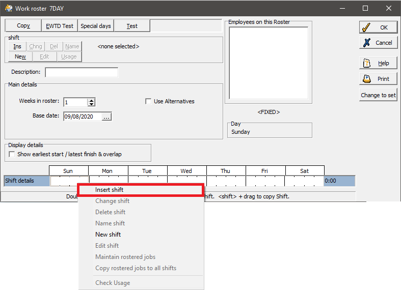 This will open the Maintain shifts window, which will display your currently created shifts. There are two important drop-down menus on this screen: