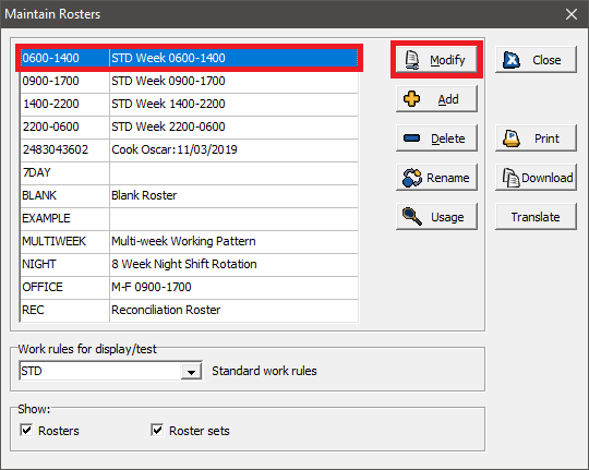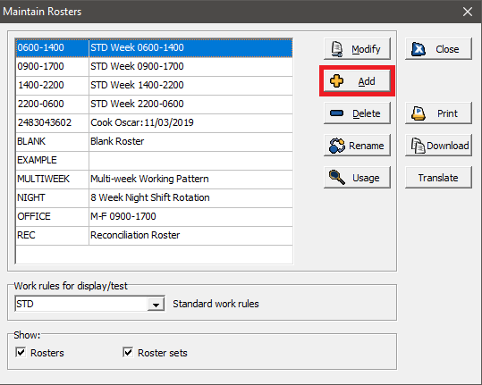 The Maintain Rosters window will then open. To add a new Roster, click the Add button.