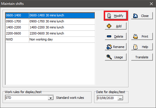 To Maintain a shift (e.g. change the start and end times), highlight the Shift in the Maintain shifts window (accessed from the System menu in the WinTMS toolbar), then click Modify.