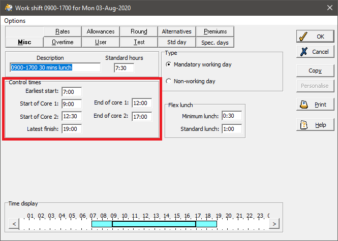 - Start/End of Core 1 time: this marks the start and end time of the first Core time (e.g. a time in which the Employee must be working)
