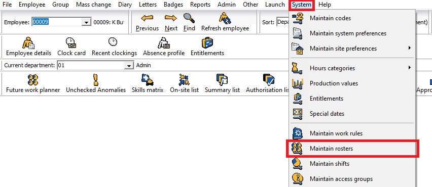To setup a roster, open the System menu in the WinTMS toolbar, and then click Maintain rosters.