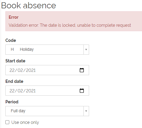 Similarly, if a Supervisor or Employee tries to book an Absence on a locked Shift: