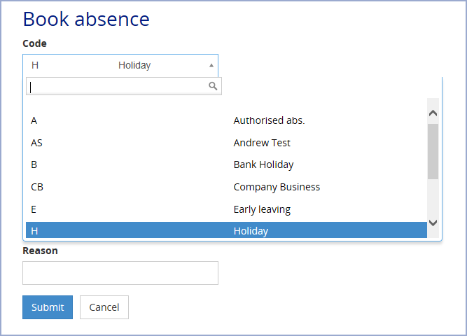 While using the system, you will often need to make a selection from a list of possible options. When an arrow button appears to the right of a field name, you need to click the arrow to display the list. For example, when booking an absence the Code field is a drop-down list: