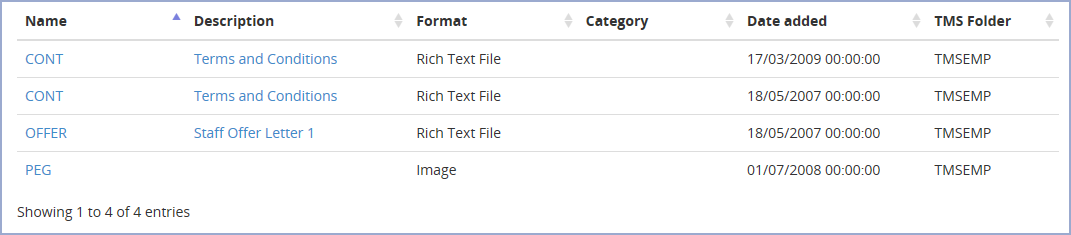 When a table is present in a feature, you have the option to sort the information into alphabetical order, time order, date order and so on. Two arrow buttons will appear next to the column names, clicking them will sort the column into ascending or descending order. For example, your Documents appear in a table: