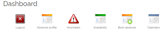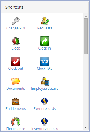 The Shortcuts widget contains icons representing TMS features available to you such as Change PIN, Employee details, Clock in/out etc. For example: