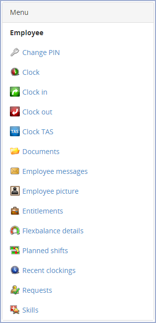 The Menu widget contains links to the TMS features available to you such as Change PIN, Clock In, Clock out etc. For example: