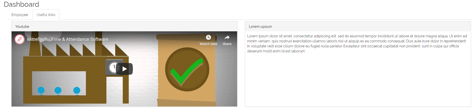 Summary widgets — display dynamic TMS information. For example the Entitlements widget might display information about your current holiday entitlement. Clicking a Summary widget opens the relevant TMS page.