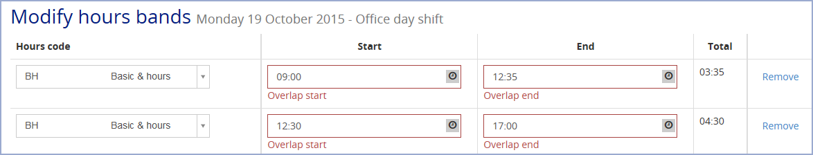 If you attempt to add or modify an Hours band that overlaps another, you will see the following error message: